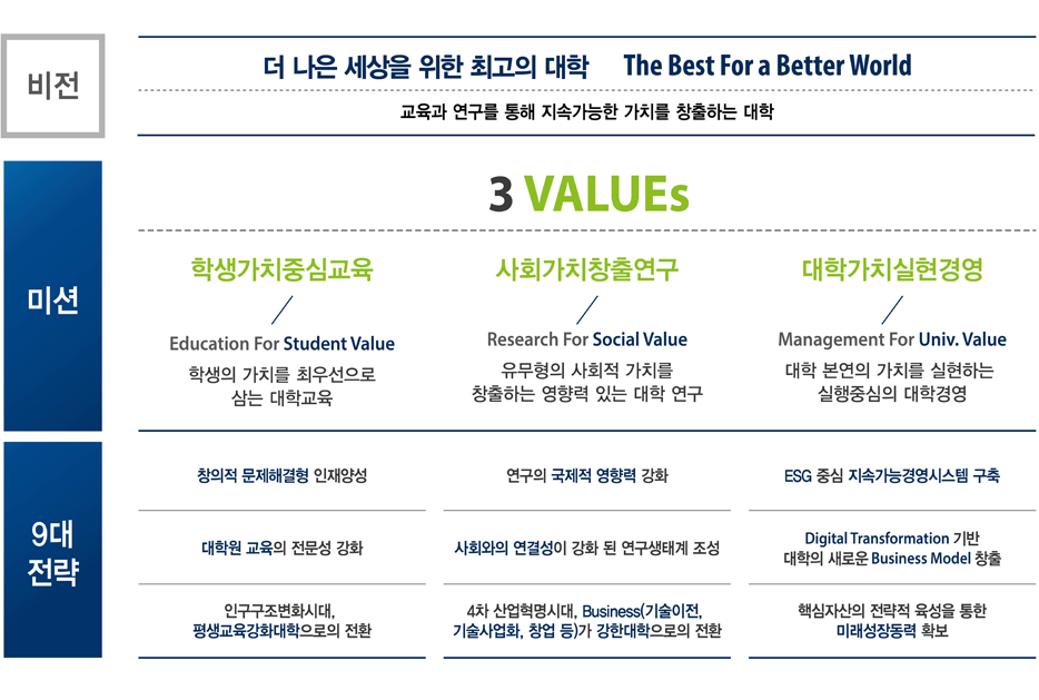 1. 건학이념에 기반을 둔 인류를 위한 창의적이고 실용적인 학문 후속세대 양성