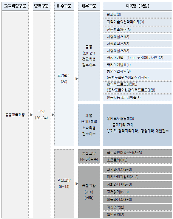 * 말과글, 과학기술의철학적이해, 전문학술영어, 사랑의실천, 커리어개발Ⅰ, 커리어개발Ⅱ, 창의적컴퓨팅, 창의적프로그래밍,